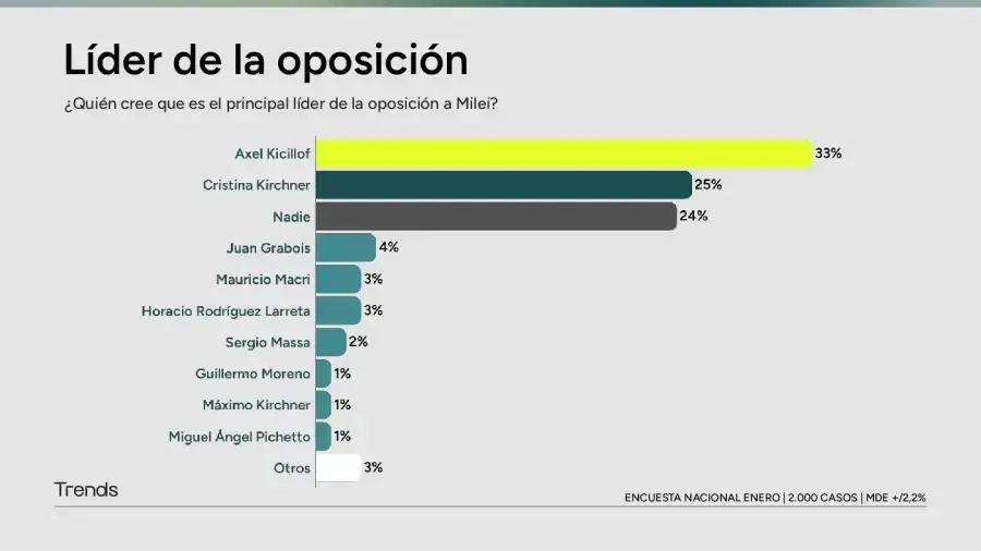 Ante la pregunta sobre quién lidera actualmente la oposición al gobierno de Milei, el peronismo aparece como la principal referencia, aunque sin una conducción claramente consolidada.